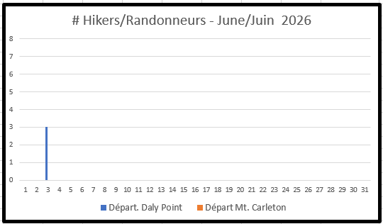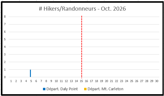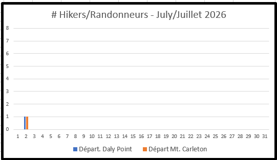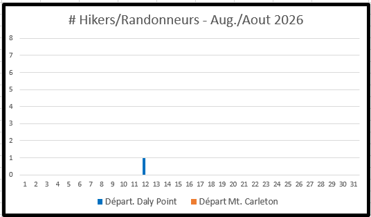 A registration form can be found at the bottom of this page but beforehand take a few minutes to review the charts immediately below. They show the number of hikers already registered, their departure dates and, if a thru hiker, the departure trailhead - either Daly Point (blue columns) or Mt. Carleton (orange columns). To avoid crowding, just pick a departure date/trailhead with no, or few, registrations.