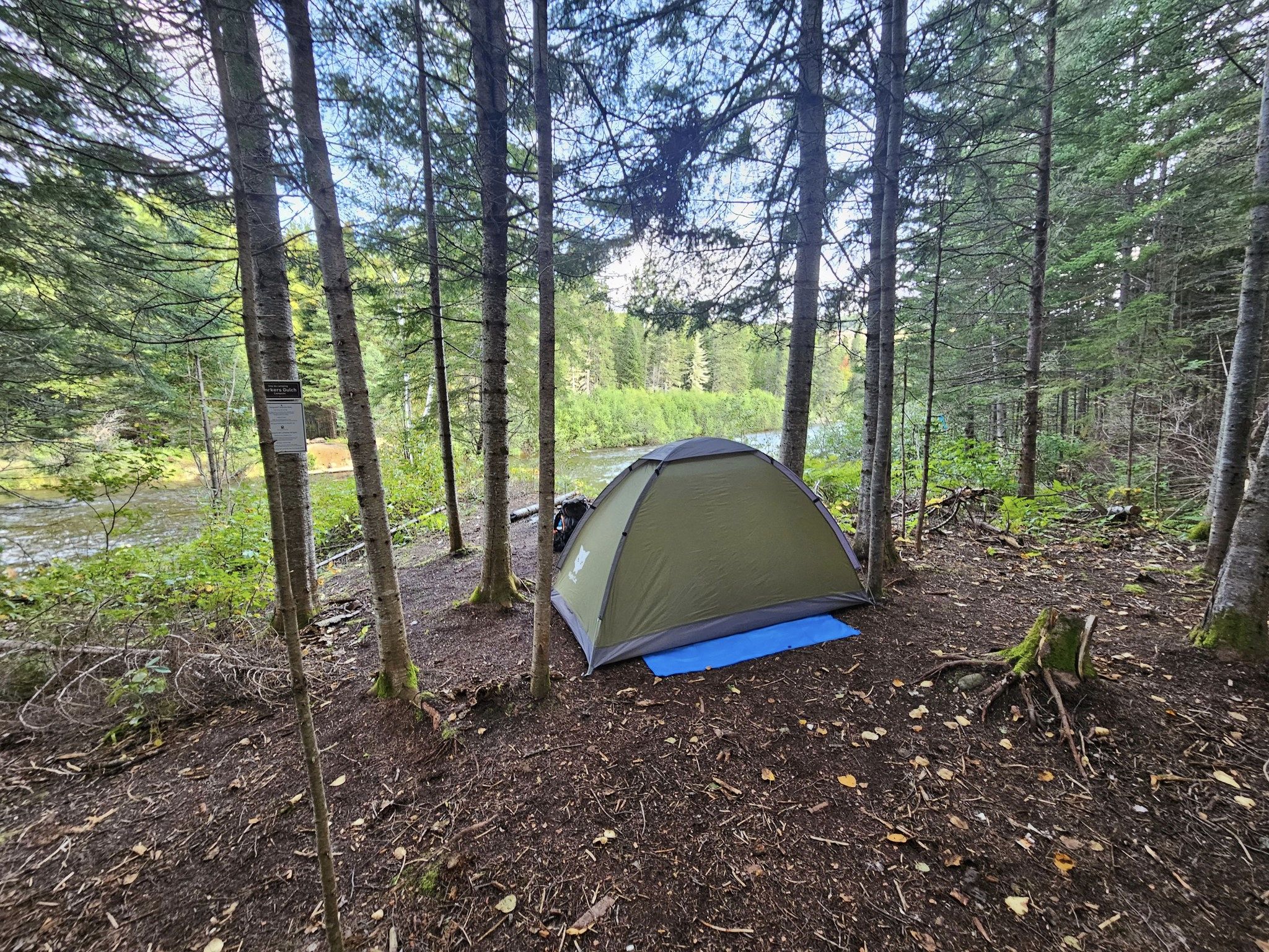 Le premier emplacement de camping après avoir quitté le point de départ du sentier est à la réserve naturelle de la Pointe-Daly (km 0) se trouve au camping Gitpu (Aigle) au km 24. Par la suite, des emplacements de camping peuvent être trouvés à une distance de 2 à 15 km jusqu’à la fin du sentier dans le parc du Mont-Carleton (point de départ ouest du sentier – km 150). Tous les emplacements de camping sont à portée de vue de la rivière Nepisiguit et d’un approvisionnement en eau facilement accessible (à l’exception du site du Popple Depot qui nécessitera une marche de 300 mètres jusqu’au pont Popple Depot). Les sites de camping sont indiqués sur la carte interactive . Il est fortement recommandé d'acheter et d'emporter avec vous le guide très détaillé SNMT et sa carte topographique (FAQ #3) lors de vos randonnées.