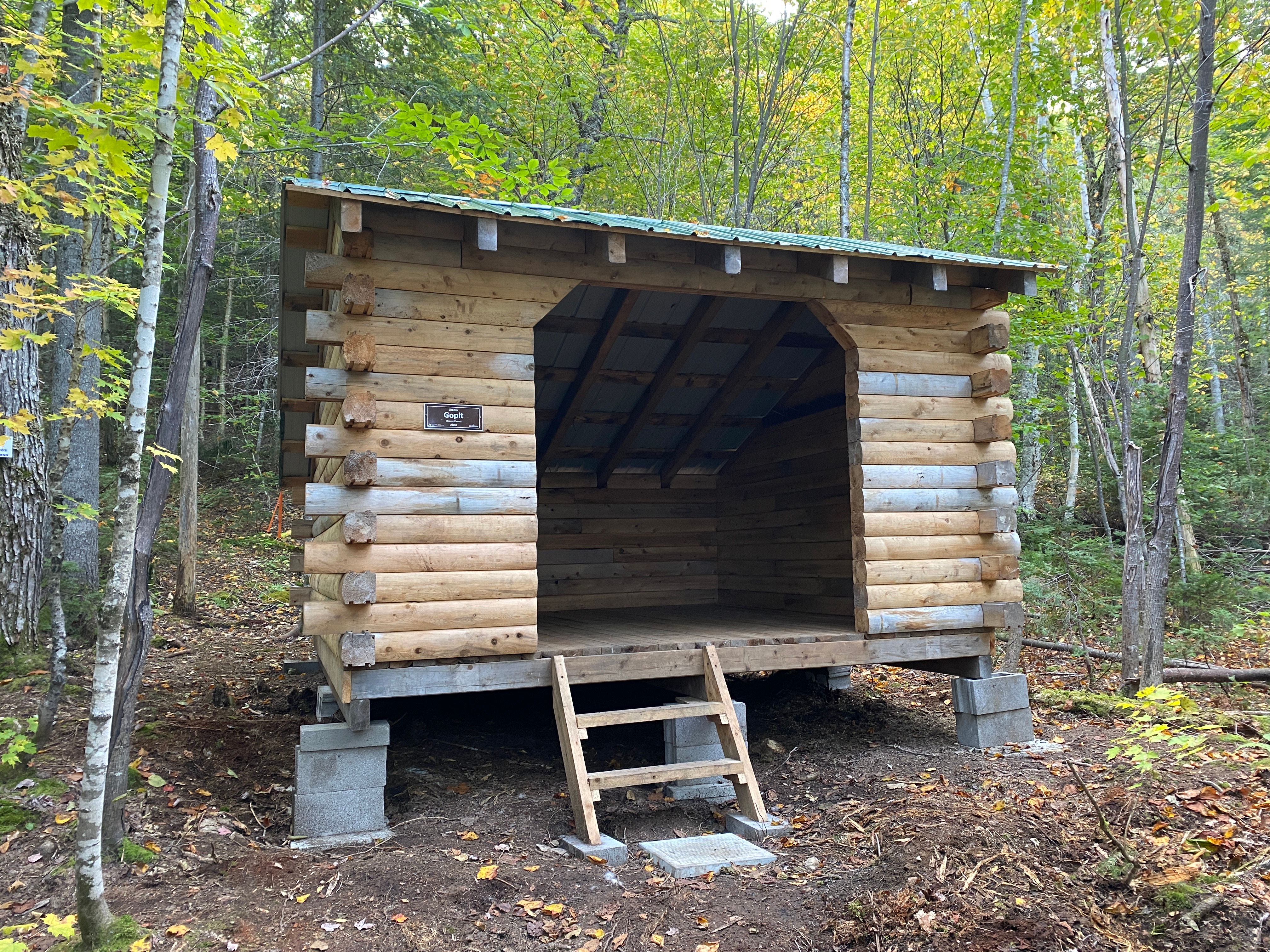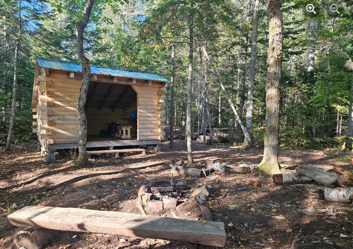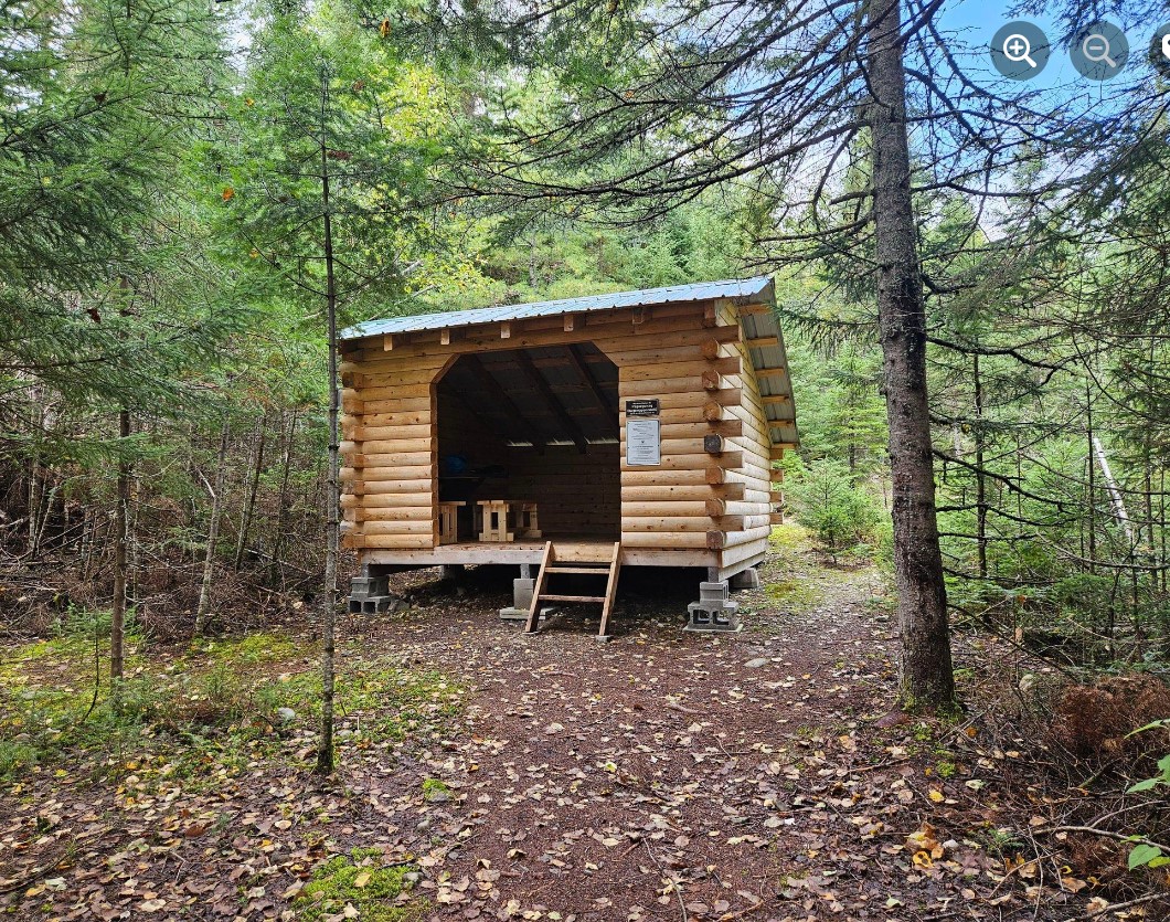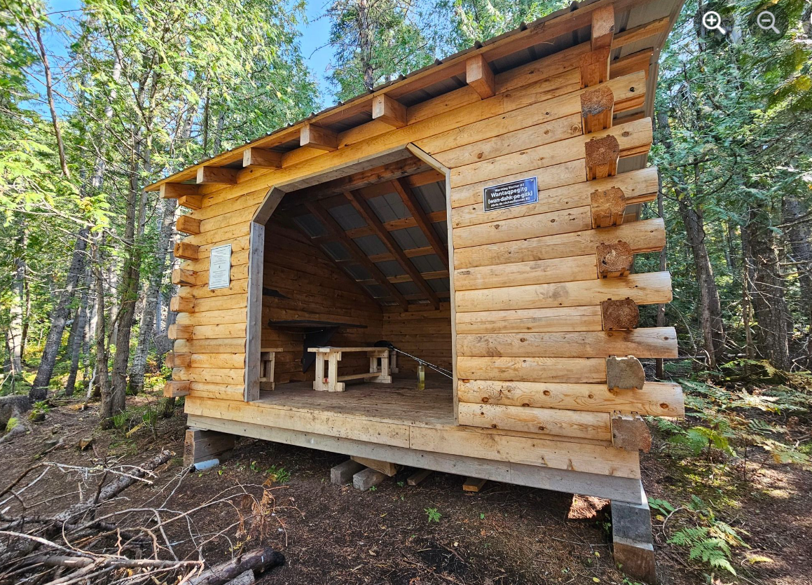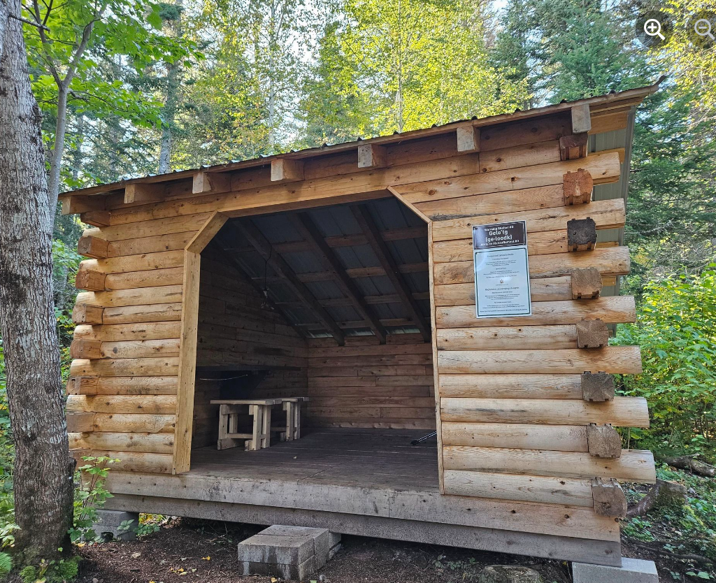 Papog’jigj (Bah Bohk jeej) signifie « Petites eaux ludiques ». Cet abri est construit près de la rivière Nepisiguit avec une vue dégagée sur la rive opposée où les eaux du ruisseau 40 Mile se rejoignent.